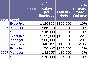 This report compares the average salary per employee, based on employee level, with published industry standard salaries across years.