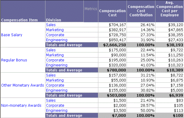 Use this report to see how different divisions distribute individual compensation items such as base salary and regular bonus. You can select the year to view.