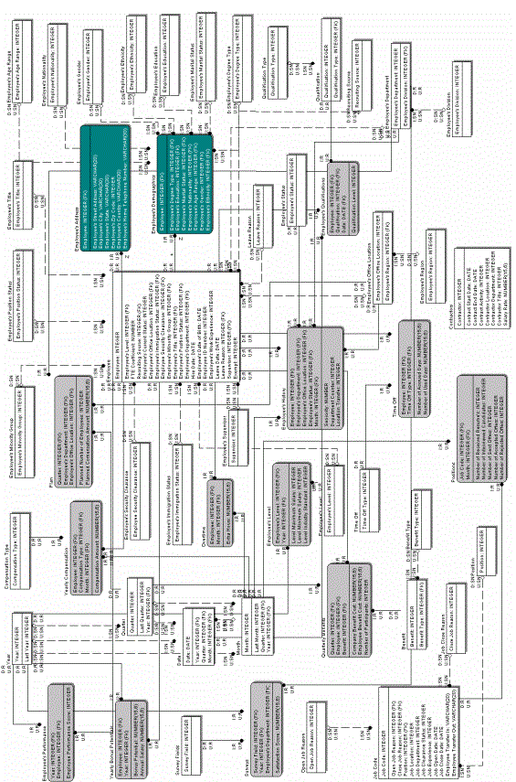 The following diagram is based on the logical model shipped with the HRAM, and is provided here to give you a general idea of the tables and columns in the logical schema. The logical schema diagram is available in an Erwin file, located in Program Files (x86)\MicroStrategy\Analytics Modules\HRAM\HRAM.erwin.