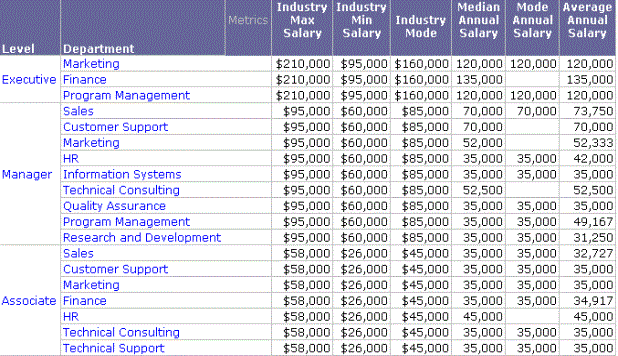 This report compares the average salary, the most common salary, and the median salary across employee level and company department, and compares them to the industry mode and range.