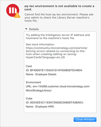 Diese Fehlermeldung wird beim Erstellen oder Bearbeiten einer Karte angezeigt. In der Regel ist dieser Fehler das Ergebnis eines Netzwerkproblems, bei dem HyperIntelligence keine Verbindung mit Ihrer Umgebung herstellen kann. Um den Fehler zu beheben, wird empfohlen, die Host-Datei Ihres Computers so zu ändern, dass Sie Ihre Server-IP-Adresse und Ihren Server-Hostnamen enthalten. Weitere Informationen finden Sie unter KB482957.