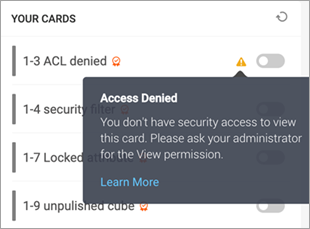 Dieser Fehler wird in der Erweiterung angezeigt, wenn Sie nicht über den erforderlichen Sicherheitszugriff verfügen. Zum Anzeigen von Karten müssen Sie über verfügen Anzeigen Zugriff oder höher auf die Karte und den Cube. Informationen zum Ändern der Berechtigungen für ein Objekt finden Sie unter Kontrolle des Zugriffs auf Objekte: Berechtigungen.