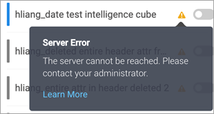 - Sie haben einige Karten gleichzeitig aktiviert, als der Intelligence Server ausfällt. Der Fehler wird angezeigt, wenn Sie die Erweiterung aktualisieren. Kontaktieren Sie Ihren Administrator, um den Status des Intelligence Servers zu überprüfen.