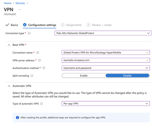 [アプリ] > [iOS/iPadOS] に移動し、MicroStrategy HyperMobile アプリケーションを編集します。手順 2 で作成した VPN プロファイルを選択し、[割り当て] > [アプリ設定] > [VPN] を編集して、変更を保存します。
