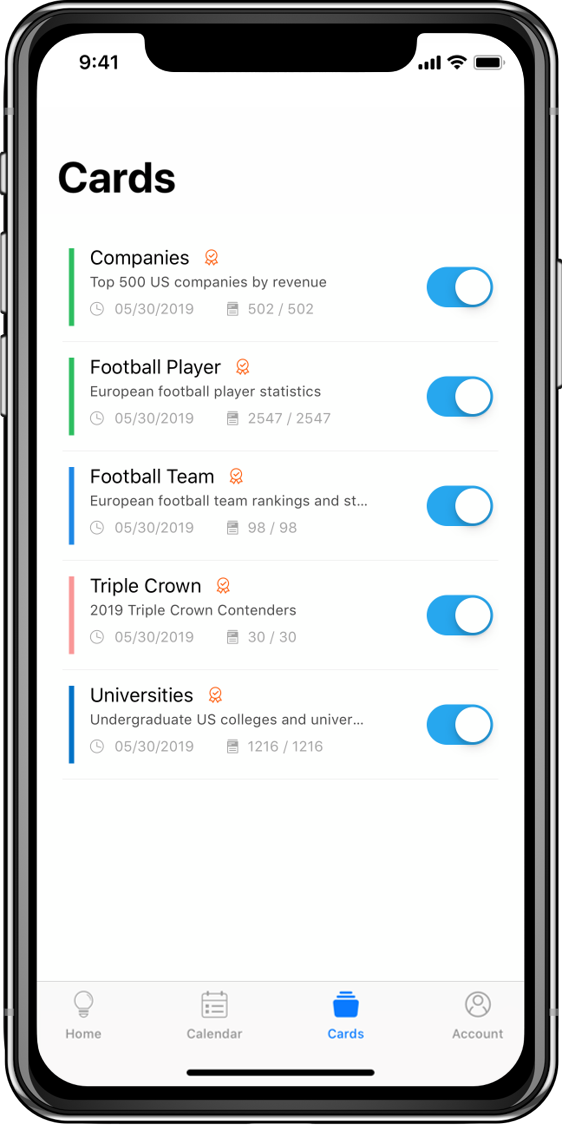 現在の環境で使用可能なすべての認定カードを管理します。各カードには、使用可能なカードの枚数と最終更新日が表示されます。タップするごとに有効/無効が切り替わります。切り詰められたカード名または説明を長押しすると、コンテンツの全文を表示できます。