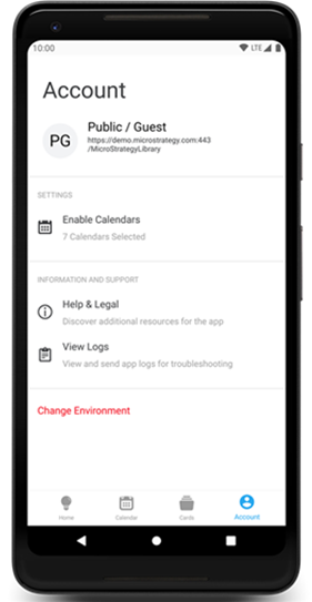 HyperIntelligence for Mobile アプリケーションのタブでは、カードの表示や検索、カレンダーのアクティビティに関連するカードの表示、アカウント設定の確認ができます。