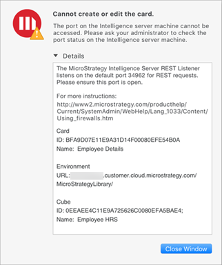 カードの作成または編集のとき、データを取得できないとこのエラーが表示されることがあります。多くの場合は、ファイアウォールまたはロード バランサーに証明書が存在しないのが理由です。このエラーを解決するため、ファイアウォールまたはロード バランサーのトラストストアにルート証明書を追加します。手順については、「証明書ストアと MicroStrategy Library との統合」を参照してください。