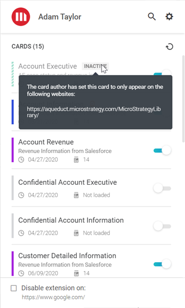 MicroStrategy 2020 Update 1 には、HyperIntelligence for Web を使用して、カードを表示できる特定のサイトをリスト アップするオプションがあります。