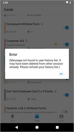 HyperIntelligence for Mobile 앱에서 캘린더 탭을 처음 열면 " 이벤트에 대한 카드가 없습니다" 메시지가 표시됩니다. 그 이유는 캘린더 목록이 변경될 때 캘린더 탭의 데이터 소스가 새로 고쳐지지 않았기 때문입니다. 대신 변경된 캘린더 목록에 대한 사전 검색이 수행된 후 데이터 소스가 업데이트되었습니다. 이것은 MicroStrategy 기술 팀에서 조사하고 있는 알 수 있는 문제입니다.