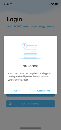 이러한 오류는 HyperIntelligence for Mobile 애플리케이션을 업데이트한 후 발생할 수 있습니다. 다양한 HyperIntelligence 제품에 대해 MicroStrategy 2019 업데이트 2에 도입된 새로운 권한 때문입니다. 업데이트된 앱이 이라는 새로운 HyperIntelligence for Mobile 권한을 확인합니다. Hyper Mobile 사용 . 이 권한을 얻으려면 관리자에게 문의하십시오. 각 권한 및 관련 라이센스에 대한 설명은 을(를) 참조하십시오. 라이센스 유형별 권한 .