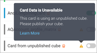 - 카드 이면의 큐브 데이터가 메타데이터 또는 Workstation에서 재구성되었거나 삭제되었습니다. 큐브가 수정되거나 삭제되었는지 확인합니다.