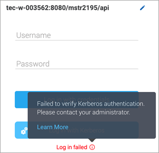 이 오류는 Kerberos가 환경에서 활성화된 마지막 인증 모드인 경우 환경 URL 아래에 나타납니다. 이 오류는 환경에 여러 인증 모드가 활성화된 경우 로그인 버튼 아래에도 표시될 수 있습니다.
