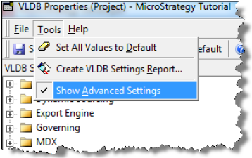In the VLDB Properties window, choose Tools > Show Advanced Settings.