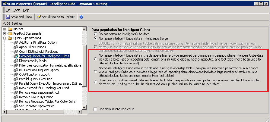 - Normalize Intelligent Cube data in the database (can provide improved performance in scenarios where Intelligent Cube data includes a large ratio of repeating data, dimensions include a large number of attributes, and fact tables have been used to attribute lookup tables as well)