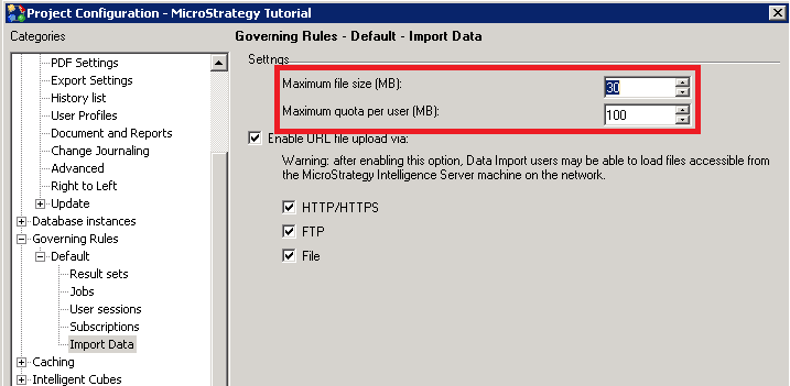 - In the MicroStrategy Intelligence Server Configuration editor, expand Governing Rules, expand Default, and select Import Data.