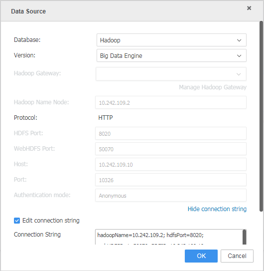 Die IP-Adresse des Hadoop-Namensknotens lautet: 10.242.109.2, und die HDFS-Portnummer lautet standardmäßig: 8020. Das MicroStrategy Hadoop Gateway ist auf der Host-IP bereitgestellt: 10.242.109.10 mit Port: 30005 (Port kann in der Konfigurationsdatei des MicroStrategy Hadoop Gateway konfiguriert werden). Die Verbindungszeichenfolge für die obigen Daten sollte wie folgt aussehen: