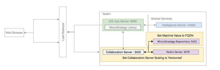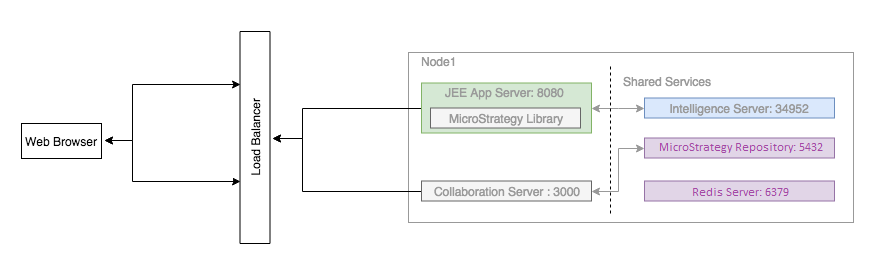 Node 1 is obtained by performing a fresh installation of the Strategy One Platform, so it contains the Strategy Library application, the Collaboration Server, and the Intelligence Server.