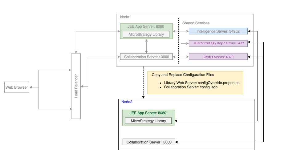 Node 2 can also be obtained by performing an installation of the Strategy One Platform, but it is configured so the Strategy Library application points to the Intelligence Server in Node 1 and the Collaboration Server points to the Collaborations Stores in Node 1. Both Nodes operate with the same data.