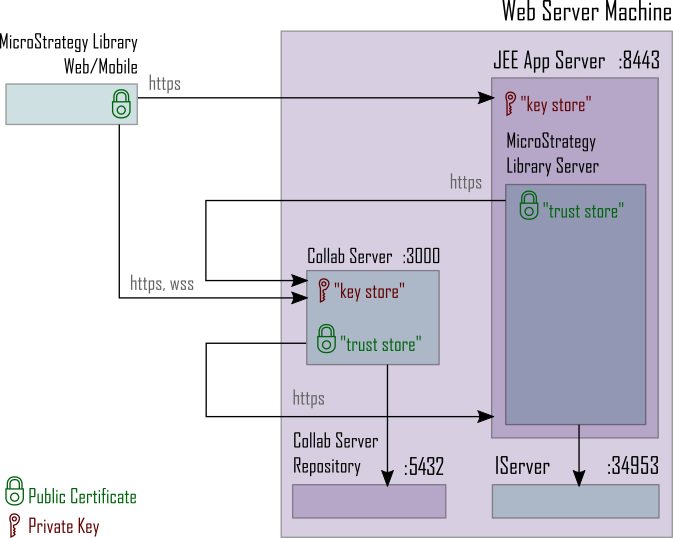 The key store is used for trusted communication between the Library Web/Mobile Client and the Collaboration server. The certificate is used to verify the identity of the Library server. The key store and certificates are configured in the