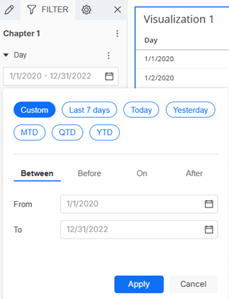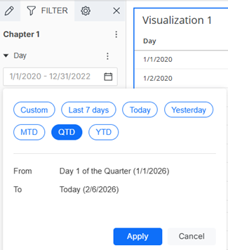 You can also choose quick dynamic date options such as last seven days, today, and month to date (MTD) when the filter is a date. In the example below, the current date is February 6, 2026. When QTD (Quarter to Date) is selected in the chapter filter, it resolves to the date range of day 1 of the quarter (1/1/26) through the current date. For steps, see Filter a Chapter by Creating a Quick Dynamic Date.