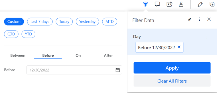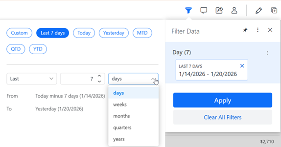 - You can create a quick dynamic date filter by selecting one of the other options, such as Last 7 Days, Today, or MTD. For steps, see Filter a Chapter by Creating a Quick Dynamic Date.