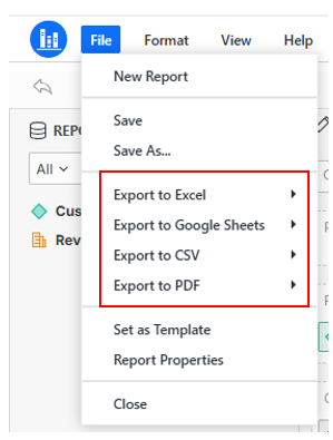 From the File menu, select the desired export format: Excel, Google Sheets, CSV, or PDF.