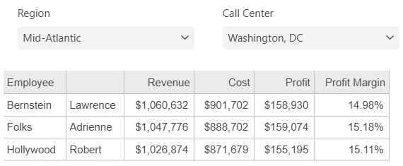 If the report is paged, drop-down lists display at the top of the report. In the example below, the report is paged by region and call center.