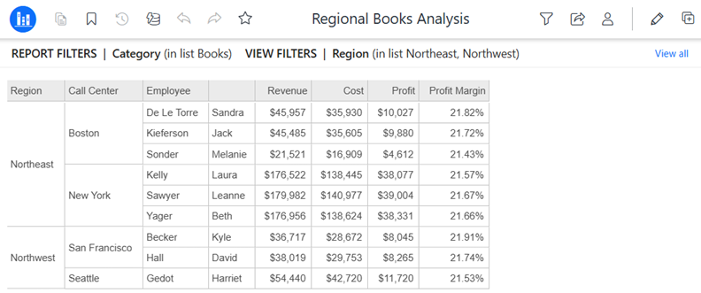 The filter summary below the toolbar displays the report filters and view filters, allowing you to review how the report is filtered.