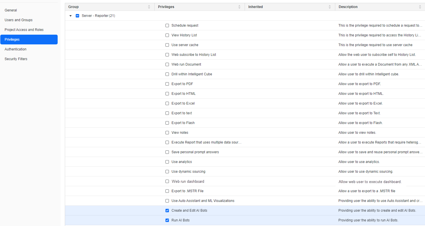 Un usuario al que se le ha concedido el Crear y editar bots de IA privilegio, se le concederá automáticamente el Ejecutar bots de IA privilegio. Si el Ejecutar bots de IA se revoca el privilegio, el Crear y editar bots de IA privilegio se revoca automáticamente.