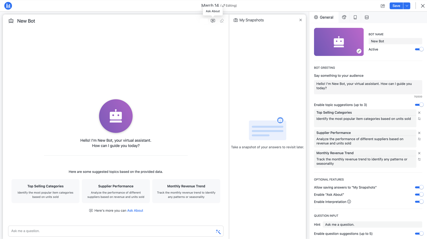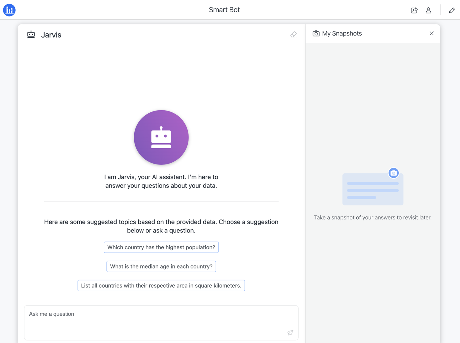 MicroStrategy ONE (2024 年 3 月) 以降では、ボットを使用して、Library Mobile で選択したデータセットに関する洞察を収集できます。スナップショット パネルを使用して、ボットの応答を将来使用するためにスナップショットとして保存したり、ボットをサイトに埋め込んだりすることもできます。