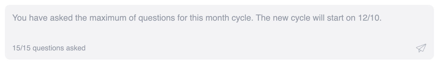 質問制限に達すると、30 日間の期間が終了するまで新しい質問をすることはできません。ただし、ボットを開いてチャット履歴やスナップショットを表示することは可能です。
