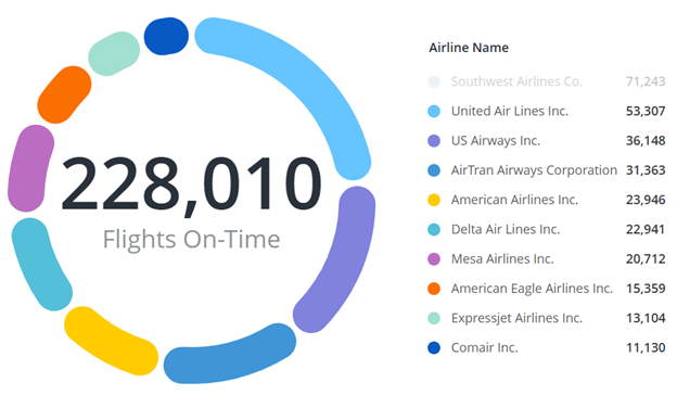 カーソルをセグメントの上に置くと、セグメントの正確な値が表示されます。正確な貢献度を知ることで、リソースの割り当て、外れ値の特定、または改善の機会の強調表示を行うことができます。以下の例では、航空会社名、定時便数、およびパーセンテージ貢献度がポップアップに表示されます。これにより、特に凡例が非表示になっている場合、インサイトの発見が高速化されます。