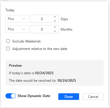• 日付を日数でオフセットするには、の前のドロップダウン リストから プラスまたはマイナスを選択します。オフセット値を日数で入力します。