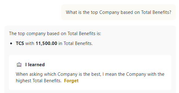 環境全体のチャットでのやり取りから収集されたすべての学習内容を表示および管理します。応答にマウス カーソルを持っていくだけでなく解釈
