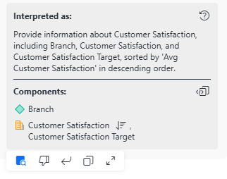 「顧客満足度について教えてください」という質問にボットがどのように回答するか、以下に表示します。これは自由形式の質問として解釈されます。興味深い関連情報を複数の項目にわけて表示しようとします。説明には、平均的な顧客満足度スコアと、最高値および最低値の支社が表示されます。また、目標に達した支社がいないことも示します支社ごとのすべてのスコアと目標をグリッドに表示します。