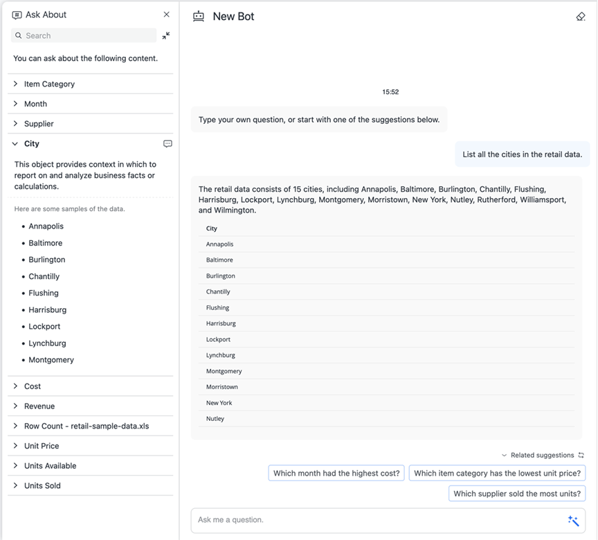 MicroStrategy ONEから開始 (2024 年 3 月) 質問内容内ボット。この機能は、ボット デザイナーが機能を有効化した場合、ボットで使用されているデータセットのアトリビュートとメトリックの情報を表示します。