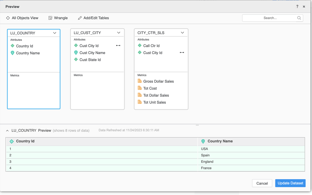 - を使用プレビュー ダイアログデータ構造の品質を改善することができます例えば、テーブルを削除してボットに含まれないようにしたり、データ列をアトリビュートまたはメトリックとして定義したり、追加の地理データを生成したりできます。
