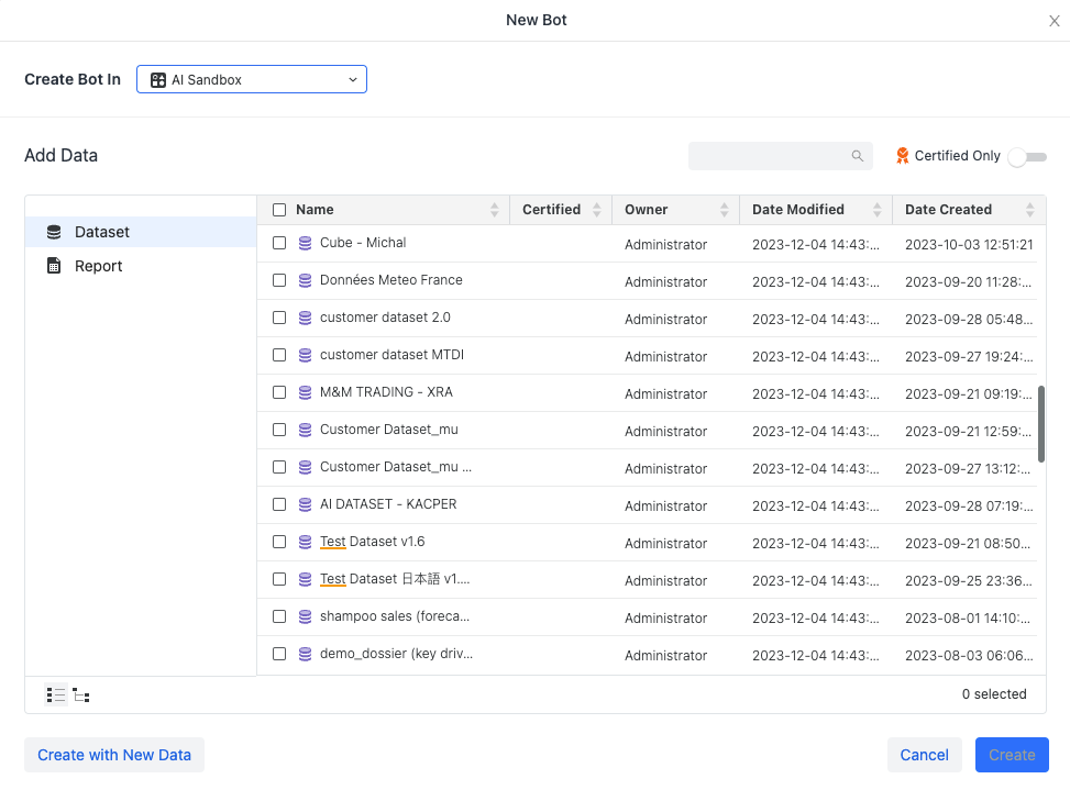 MicroStrategy ONEから開始 Update 12 では、単一のデータセットで複数のボットを作成できるようになりました。サポートされるのは、インメモリの OLAP および MTDI キューブ データセットのみです。