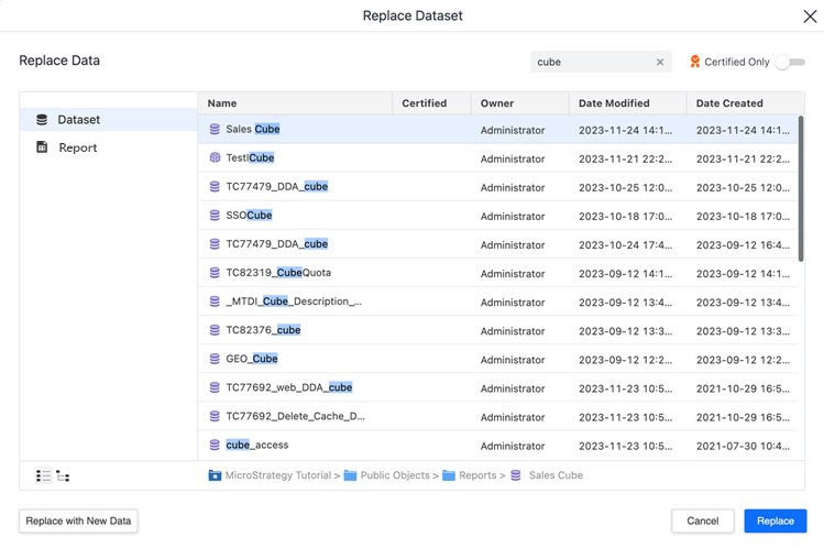 置換および選択するデータセットの次データセットを置換。 - データセットを既存のデータセットと置き換えるには、公開されたデータセットを選択して、を置換。