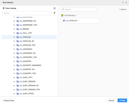 - [新しいデータセット] ウィンドウで、データ カタログのデータ ソースを選択し、新しいデータセットを選択します。