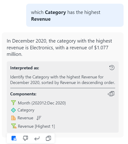 この設定が有効になっており、クエリに時刻が指定されていない場合、自動回答とボットは、データの最新の期間 (最新の月や年など) 用のフィルターを自動的に追加します。追加した時間フィルターは、[概要] に表示され解釈。応答に適用された最新 月の時間フィルターに注目してください。