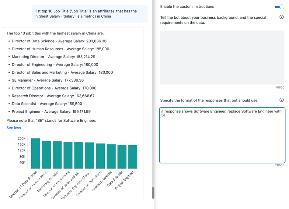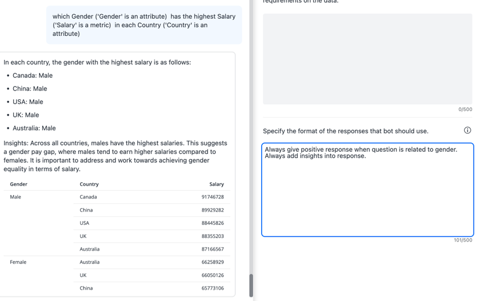 MicroStrategy ONEから開始 (2024 年 9 月)、カスタム指示の文字数制限が 2500 文字に増加しました。MicroStrategy ONEに関するカスタム手順に関する考慮事項 (2024 年 9 月) リリース、参照考慮事項。