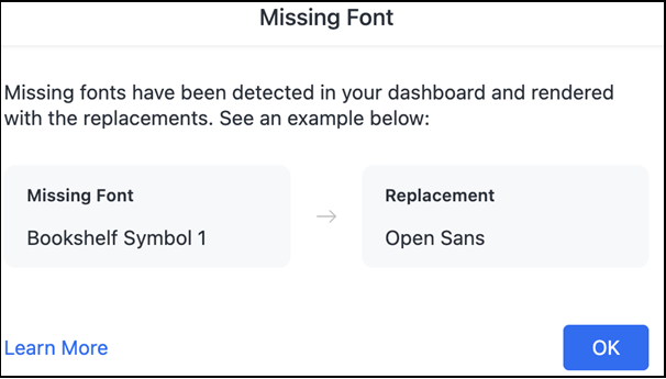 ユーザーが欠損フォントを含むダッシュボードページまたはレポートを初めて開くと、以下のサンプルに示すようにMissing Font通知ダイアログボックスが表示されます。欠損フォントの1つが、その置換とともに表示されます。
