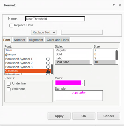 ダッシュボードまたはレポート内の各オブジェクトで使用されているフォントを確認してください。以下の例に示すように、欠損フォントはFontドロップダウンリストで明確にラベル付けされ、欠損フォントのレンダリングに使用されるフォールバックフォントを簡単に確認できます。