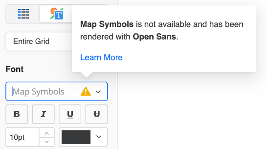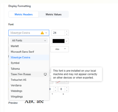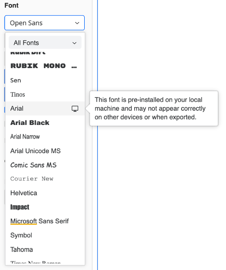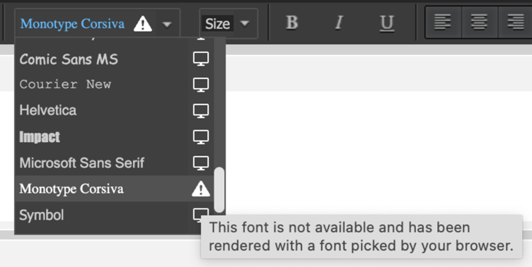 • フォントがクライアントOSで欠損している場合、リスト内のフォントの隣に警告アイコンが表示されます。フォントはブラウザが選択したフォントでレンダリングされます。