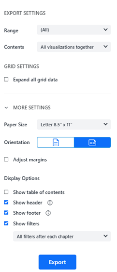 範囲ドロップダウン リストを使用して、ダッシュボード内のすべてのチャプターとページをエクスポートするか、個別のチャプターやページを選択してエクスポートします。