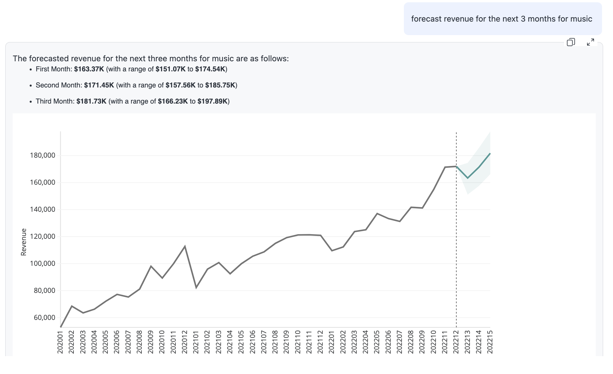 自動回答の回答は、予測線グラフ ビジュアリゼーションと予測データの明確な自然言語での説明で構成されているため、その先にあるものを簡単に理解できます。チャット パネルの限られたスペースでレンダリングされた場合、ビジュアリゼーションは限られた数のデータ ポイントを含む可能性がありますが、プロンプトの回答を展開すると、既存のデータ ポイントと予測されるデータ ポイントのセット全体が表示される。