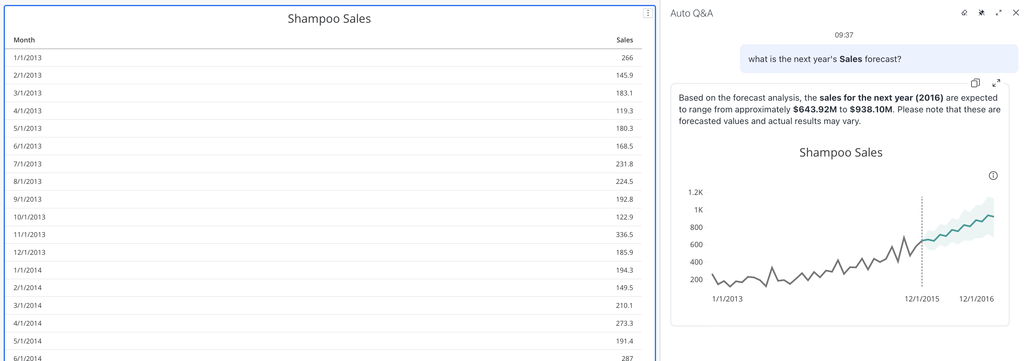 下位レベルのデータに対して上位レベルで予測: 所定の月次売上データセットから始めます。自動回答を質問すると、毎月のデータに基づいて来年の売上を予測できます。