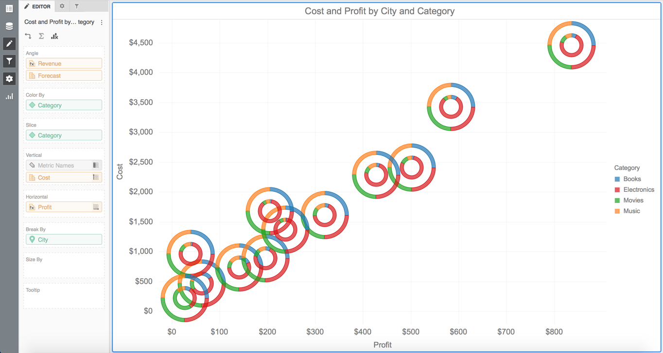 您可以使用多种显示样式来制作饼图和环形图。您可以以网格布局显示饼图,或以散点布局显示环形图。点击这里查看饼图和环形图的示例,包括每种样式的数据要求。