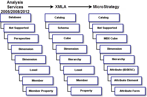 This diagram shows how Analysis Services 2012/2014/2016/2017/2019/Azure objects are exposed in XMLA and then how they are related to objects in the Strategyenvironment.